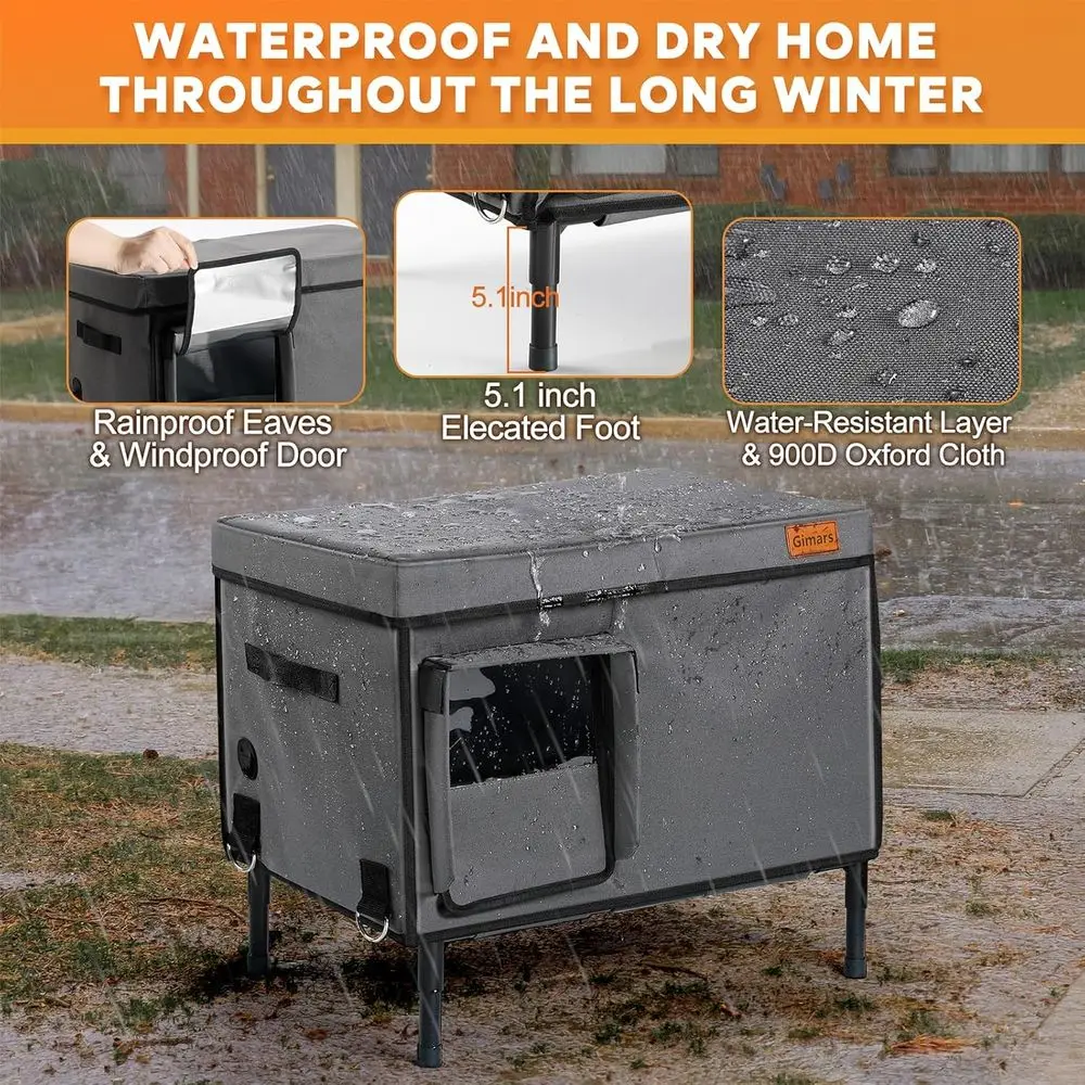 This outdoor heated cat house is designed to provide warmth and comfort for your feline friend during harsh winter conditions. It features a UL-certified heating pad that ensures your cat stays warm, and the interior is lined with heat-retaining aluminum foil to prevent heat loss and maintain optimal insulation. The durable construction is made with 900D Oxford cloth and cold-resistant materials, making it suitable for harsh weather. The cat house is equipped with rainproof eaves and a windproof door, offering superior protection against rain and wind, while the 5.1-inch elevated base keeps your cat dry and safe from water.
